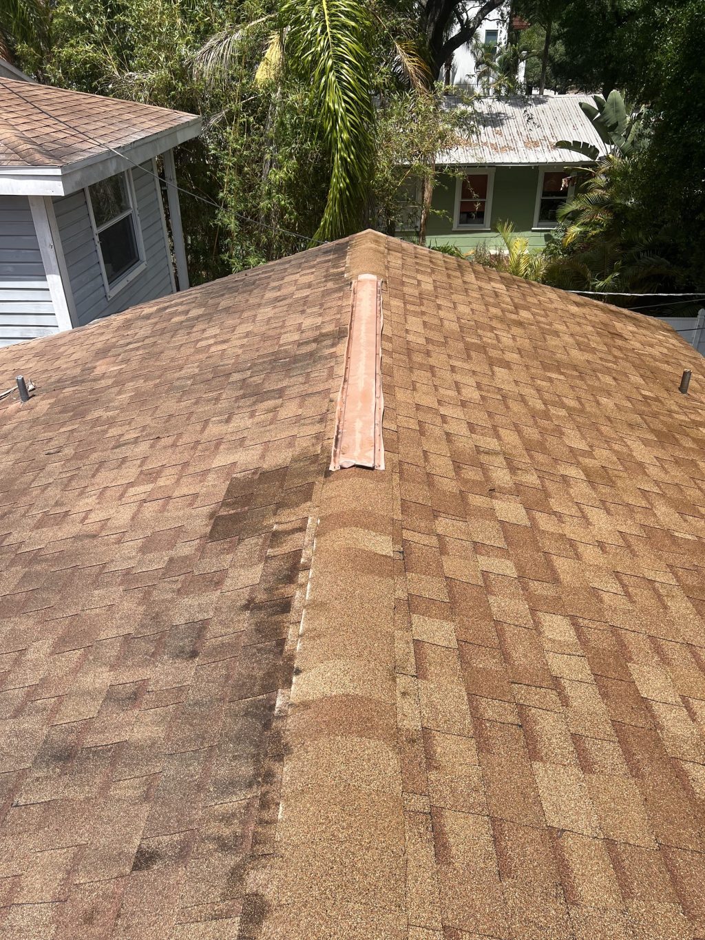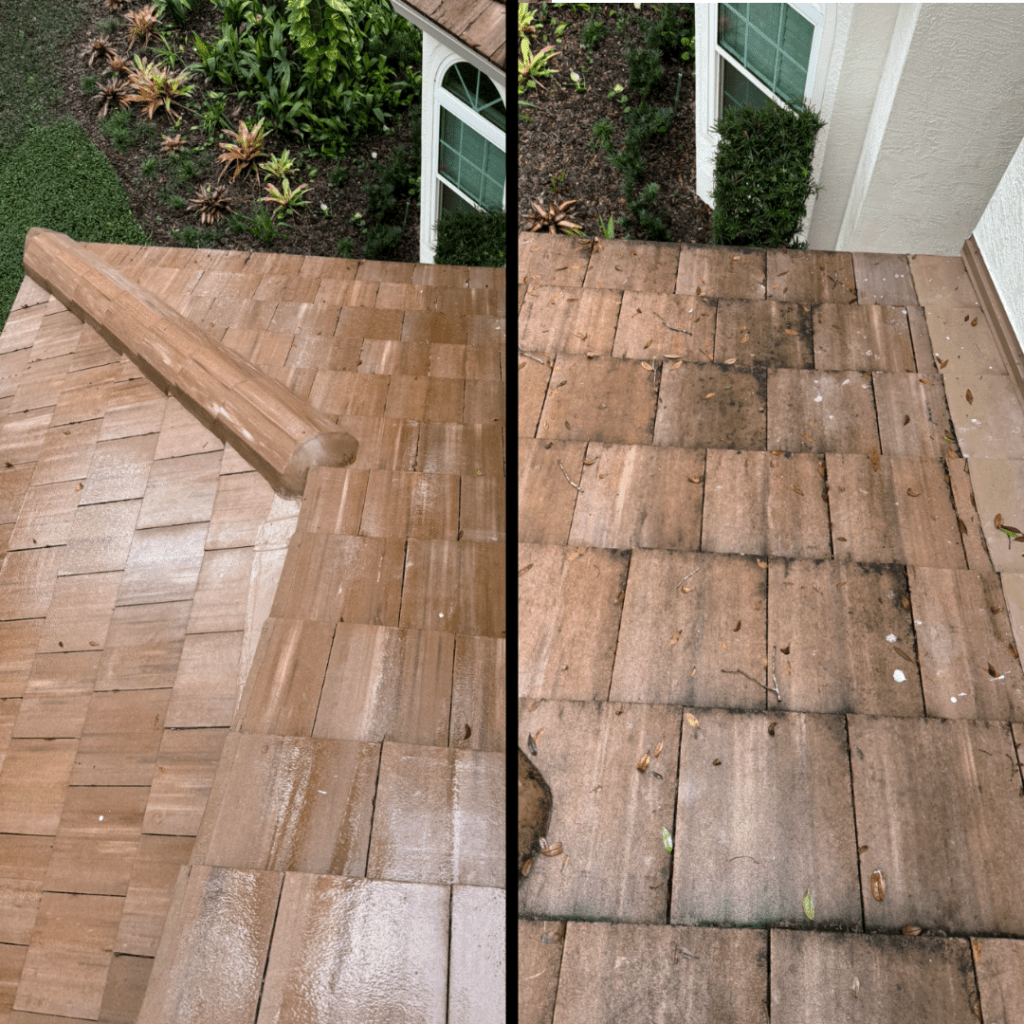 Over time, roofs collect algae, mold, and debris that not only look bad but can also cause long-term damage. At Oasis, we use a soft washing method—never high pressure—to safely clean your roof without causing any harm to shingles or tiles. Our eco-friendly solution eliminates buildup at the root, helping your roof last longer and look better. Regular soft washing is a smart way to maintain curb appeal and avoid costly repairs down the line.